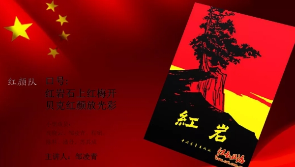 “紅巖石上紅梅開,貝克紅顏放光彩!”隨著整齊押韻的女聲口號(hào)響起,第一組紅顏隊(duì)的鄒凌青同志開始分享《紅巖》讀書心得,她談到了書中小蘿卜頭、江姐、許云峰他們鋼鐵般的意志和頑強(qiáng)奮斗的精神;學(xué)習(xí)《紅巖》,我們要學(xué)習(xí)江姐巾幗不讓須眉的奉獻(xiàn)精神,她還結(jié)合工作實(shí)際,“越是困難的時(shí)候,就越需要堅(jiān)定不移的精神去克服和開拓!越是荊棘滿布,越是要不畏艱險(xiǎn),迎難而上!”